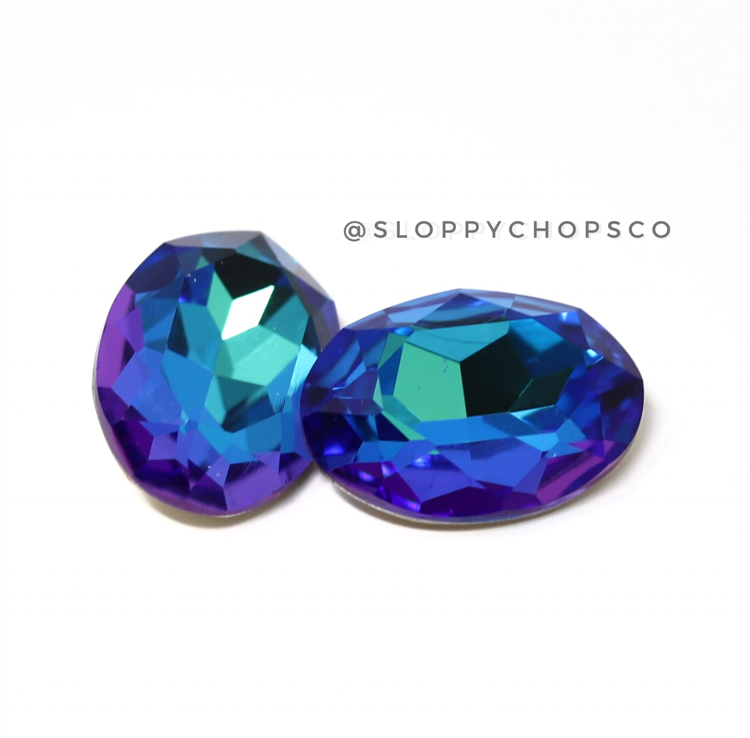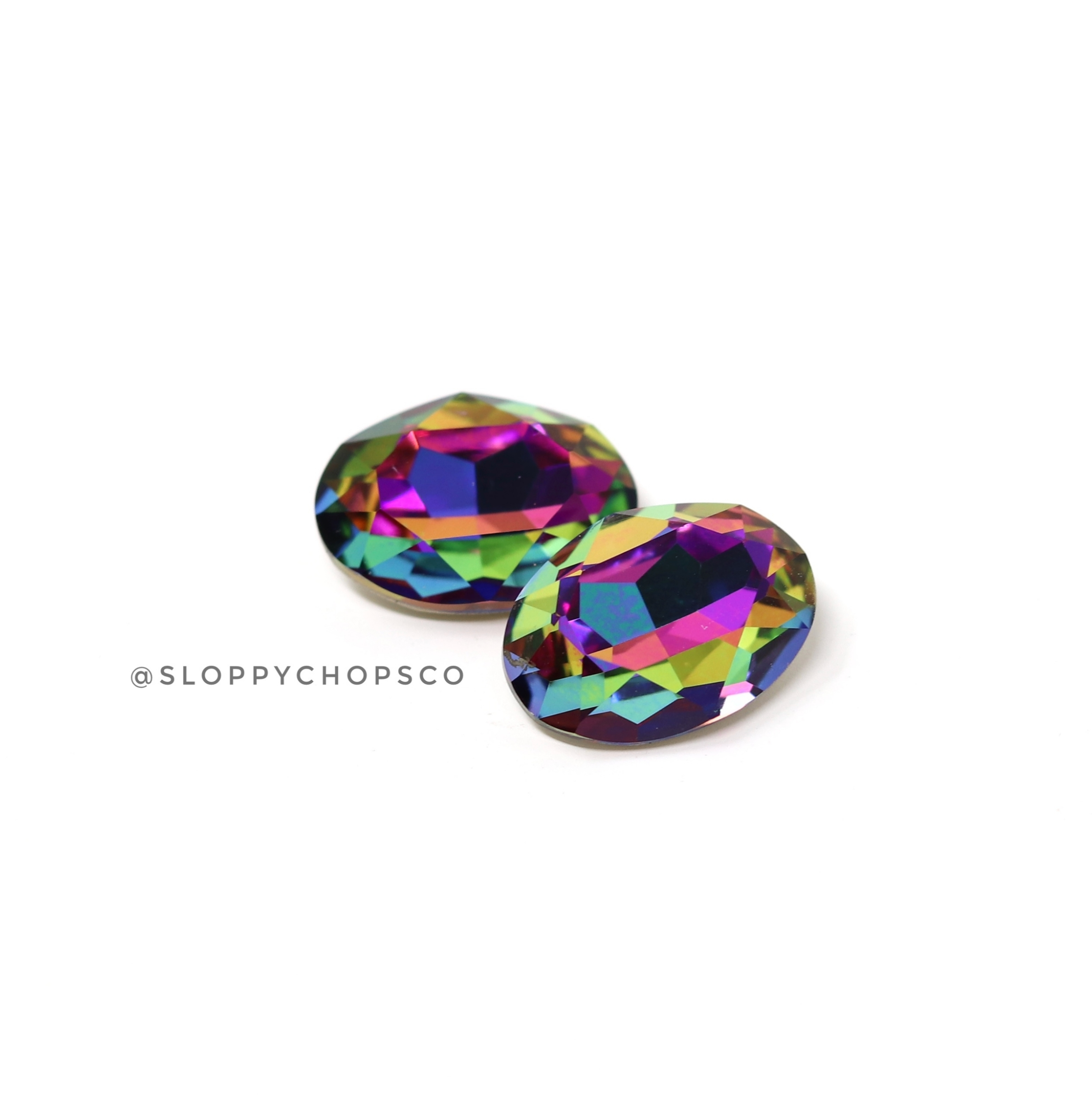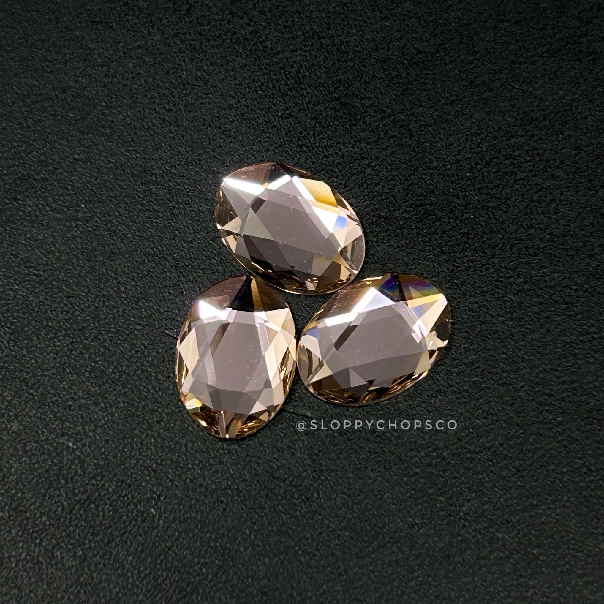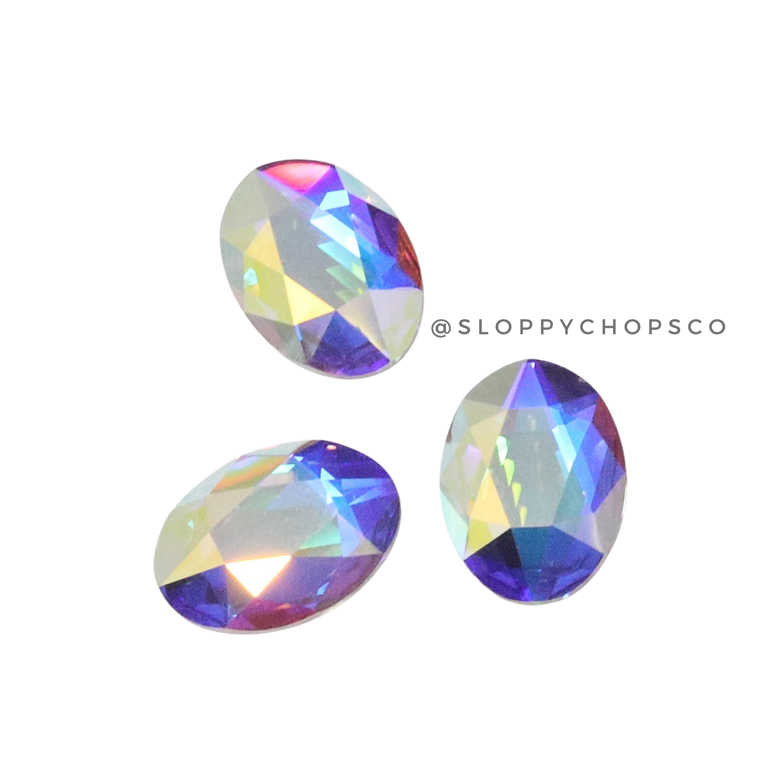 Fancy Ovals refer to large, faceted crystals that are oval in shape and have pointed backs. These are man-made and from the same manufacturers that supply our crystals.